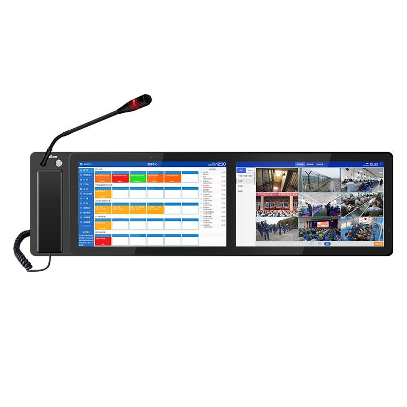 • 硬质铝合金外壳,CNC加工,双屏一体化设计;15.6英寸触摸显示屏,1080P高清视频,桌面式安装。
