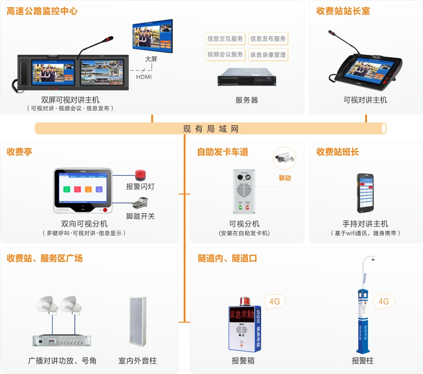 高速公路可视化应急指挥调度系统 基于IP网络架构(可跨网段跨路由),主要用于高速公路日常管理和突发事件的指挥处理。系统以监控中心为最高管理级别集中管理所有对讲、广播、发布终端设备,各收费站之间分布式管理,形成多级别、分布式管理架构体系。