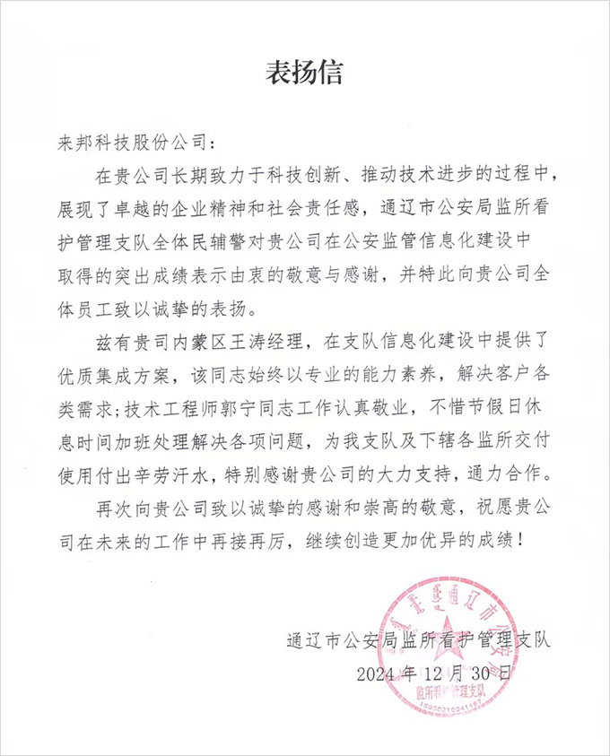 2024年12月30日,公司收到通辽市公安局监所看护管理支队发来的表扬信,对公司在该公安监管信息化建设中取得的突出成绩表示由衷的敬意与感谢,并对公司王涛经理在支队信息化建设中提供的优质集成方案,以及展现专业的能力素养解决各项问题;技术工程师郭宁的认真敬业,不惜周末加班,为支队及下辖各监所交付使用付出辛劳汗水,给予了高度赞扬和感谢。
