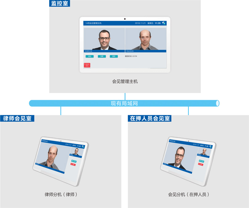 基于IP网络音视频通讯技术,主要针对当前监管场所普遍存在的律师会见次数多,看守所会见室不足和律师远途不便的需求,可实现所内和所外的律师、在押人员之间的高清可视对讲功能,进一步保障律师执业权利,提高会见效率和便捷水平。