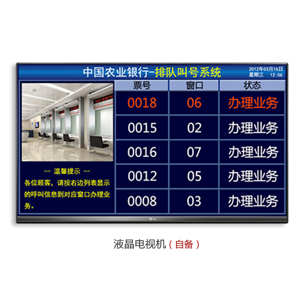 液晶电视机(自备)组成。建议选42英寸以上液晶电视机,可作为等候显示屏使用,一般放置在休息大厅的休息等待区。