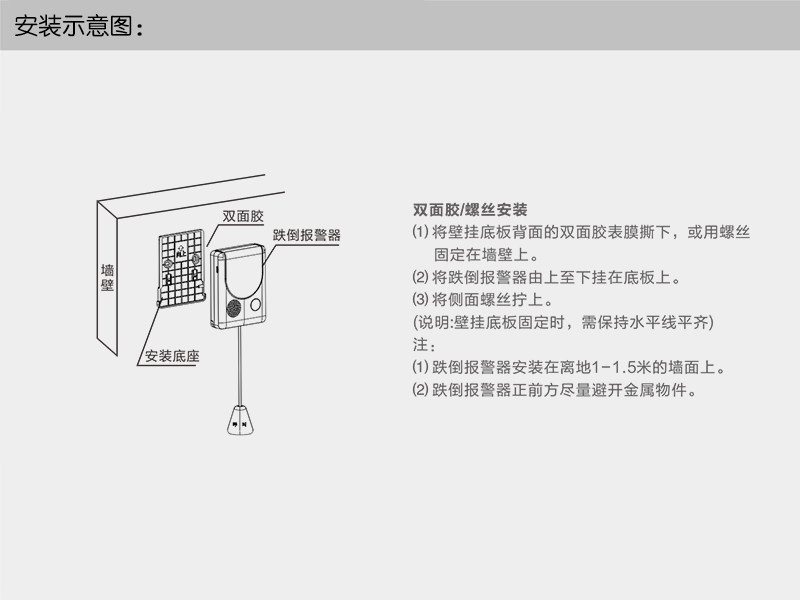 ② 集中供电:支持电源箱(推荐12V/5A)集中供电,预留RVV2x1.0线,30米内可给2台跌倒报警器供电(与商务联系)。
