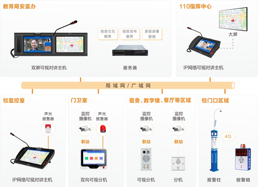 安徽省阜阳市265所中小学及幼儿园联网报警项目,由阜阳市公安局指挥中心统一管理辖区内所有学校的报警。通过在各个中小学及幼儿园的门卫处、保卫处、人流量大的地方安装报警箱,在周边路口、广场等区域安装报警柱,并且所有报警设备通过4G无线路由和光纤接入到网络中。当报警箱、报警柱呼叫,110指挥中心坐席接听后能够与终端双向对讲,同时监控大屏能自动弹出报警终端画面和绑定的IPC画面, 确认警情后可立即调度学校周边警力进行处警。