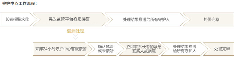 • 当民政监管平台客服遗漏处警时,巅峰国际24小时守护中心客服立即参与处警,为长者守护提供兜底保障。