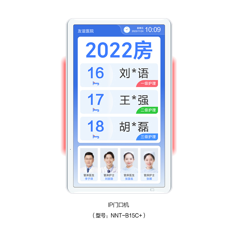 • 采用15.6英寸触摸显示屏,内置灯带双侧发光设计,壁挂式安装在病房门口。