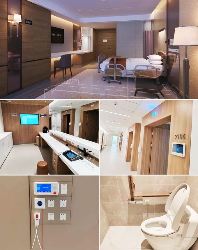 病房门口,具有信息交互显示的门口机可清晰地显示患者的基本诊疗信息、护理等级、责任医生及责任护士。智能液晶走廊屏,不仅能够直观展示病区指引、时间等常规信息,还能直观显示呼叫患者的病房、床位号,指引护士第一时间前往处理。