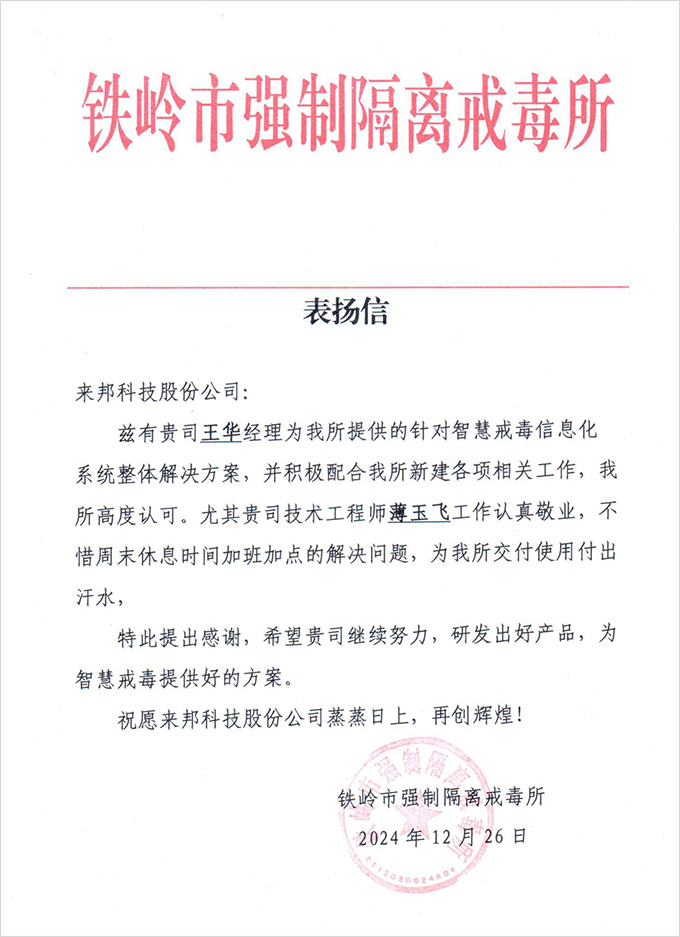 中心 “信”任满载,实力赢赞。12月26日,辽宁铁岭市强制隔离戒毒所发来表扬信,对公司王华经理提供的智慧戒毒信息化系统整体解决方案,并积极配合该所新建各项相关工作,给予了高度认可。项目交付阶段,并对公司技术工程师薄玉飞工作认真敬业,不惜周末休息时间加班加点的解决问题,为按期按质交付使用付出汗水,提出感谢。
