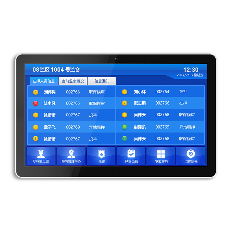 • 具有可视对讲、夜岗处警、电器开关、门禁控制、智能电教、监仓概况、信息查询、三固定表、一日作息、通知公告、