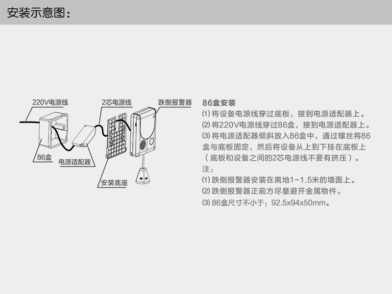 ② 集中供电:支持电源箱(推荐12V/5A)集中供电,预留RVV2x1.0线,30米内可给2台跌倒报警器供电(与商务联系)。