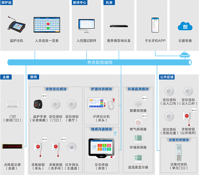 长者在床上感到不适,按下床头的手持呼叫键,照护站主机能立刻收到呼叫并伴有语音播报长者信息,门灯、走廊屏也同步发出呼叫提醒,护理人员接听后可与长者建立通话。